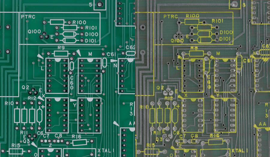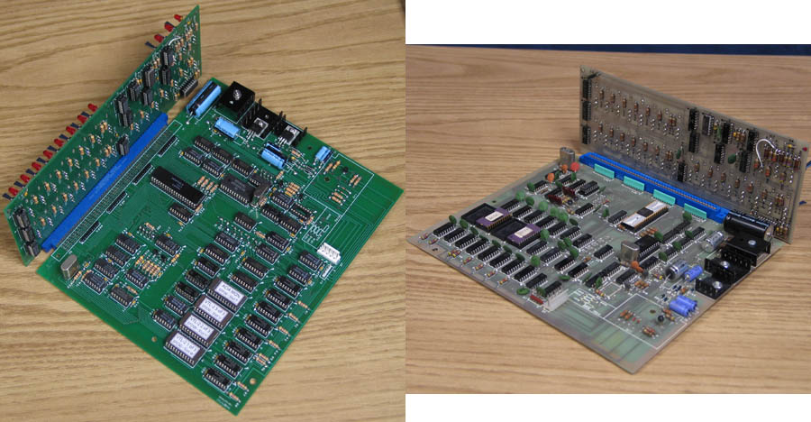 ![]() Replica-Left, Vintage-Right ![]() Replica-Left, Vintage-Right (sorry for the difference in perspective, I'll try to get better pictures later) Nothing was changed on the two boards, "Main Board" and "Front Panel", except for the silkscreen and an addition to the copper layer. I modified the silkscreen quite a bit to reflect my interpretation of MITS's intent. Using my Gerber CAD program I enlarged some silkscreen elements (like IC rectangles) and shrunk others (like resistor and capacitor symbols. On these boards I have preserved the MITS font, moved the silkscreen elements away from soldering areas, and shrunk silkscreen graphics to fit within the pads. The silkscreen modifications, in my opinion, make the boards easier to assemble and also look better. Below are pictures at 1:1 scale showing some of the differences. I have also added a solder mask to the boards which improves appearance and protects traces against solder bridges and shorts from metal objects. ![]() 2. Power Supply [Picture coming soon!]