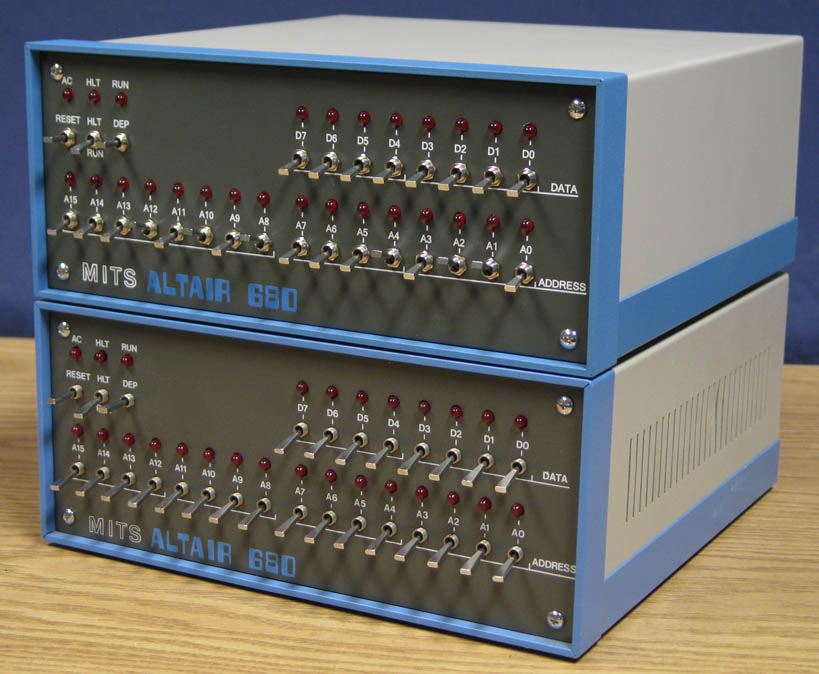 The power supplies are internally fused, and have output over voltage protection and output over current protection (overload) circuits. They also automatically recover from these faults when the fault is removed. These are dangerous because there are exposed AC voltages present. The computer should not be used unless the case cover is installed. ![]() Vintage-Bottom, Replica-Top (switch nuts not installed on vintage unit) ![]() Vintage-Bottom, Replica-Top (not all case screws installed) - The looks a little faded on the 30 year old computer! : ) The genuine Optima enclosure used in the replica is identical to the vintage Optima enclosure used by MITS. The paint/color codes used on the cases is identical to the cases sold in 1975. The front panels are powder coated and then silk screened with white ink. The only difference is the back panel, and lid. There are NO vent holes in the replica lid unlike the original. I was expecting to have vent holes, but Optima said they were not "standard". When they told me that the case was still a standard item in their catalog, I assumed that the vent holes were included. Not having vent holes does not cause overheating in the replica because of the efficient switching power supplies. The lack of vent holes also reinforces the difference between a replica and an authentic vintage unit. So what are we left with? Hopefully you will agree with me that it is be best combination of modern compromise and historic authenticity! Please contact me with ANY questions or comments you have after reading this. Thanks! Visit Stockly Electronics
